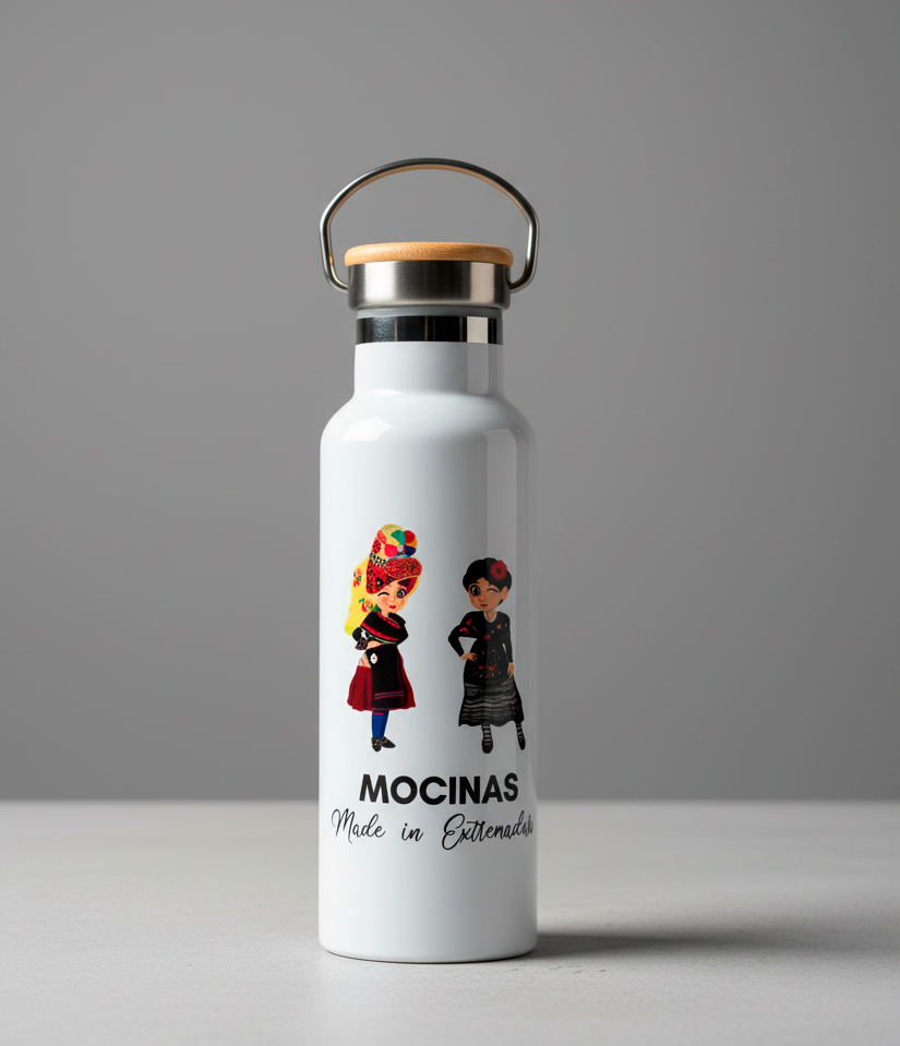 Termo de acero inoxidable con nuestras Mocinas. Pa el café calentito o el agua fresca.