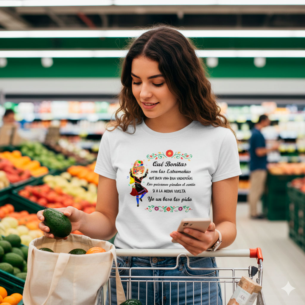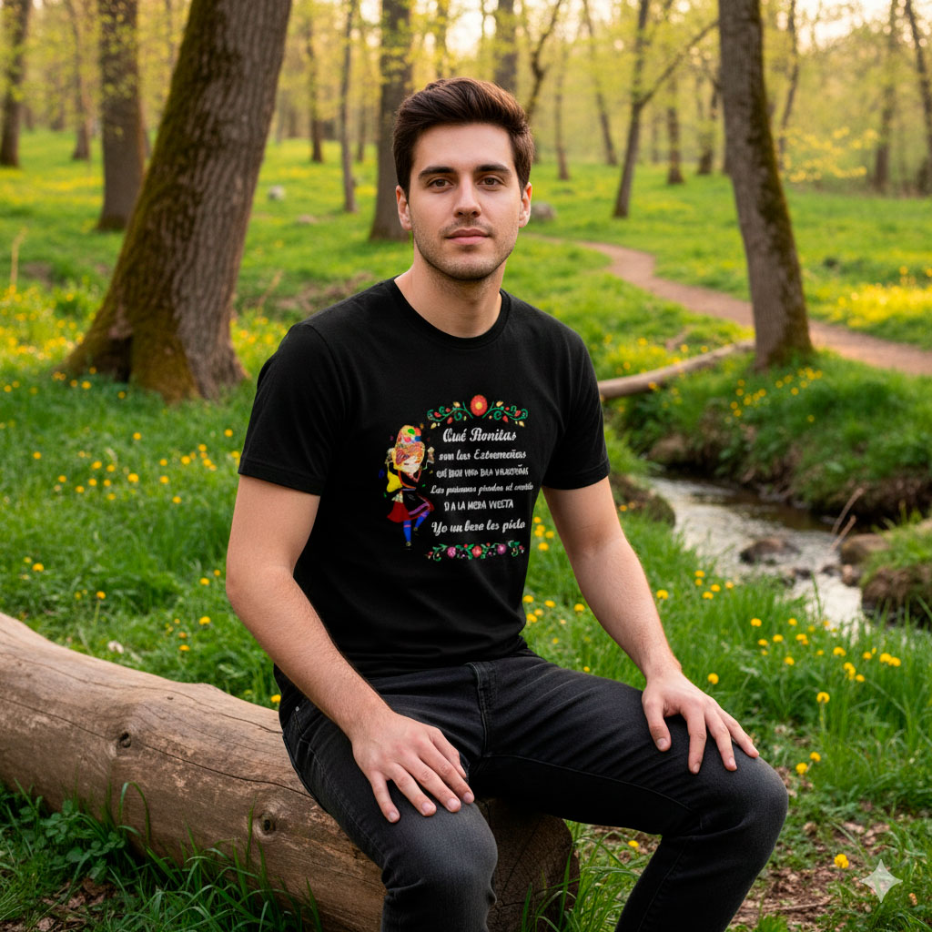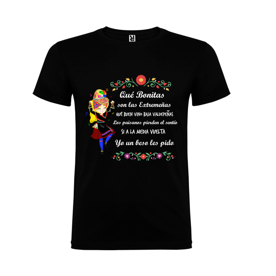 La camiseta “Extremeñas Bonitas” celebra y ensalza una de nuestras jotas más populares ‘Qué bonitas son las extremeñas’ de Alcuéscar.